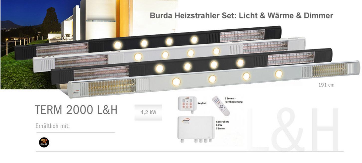 Mit dem Infrarotstrahler, Burda L&H URLH1765 haben Sie sofort Beleuchtung und Wärme für Terrasse, Balkon, Markise oder Wintergarten in Einem. Privat, aber auch für Restaurant-Terrasse der ideale Wand- oder Deckenheizstrahler.