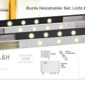 Burda Heizstrahler im Komplettset: Term 2000 Duo - Terrassenstrahler mit Licht und Wärme in Kombination. Das Terrassenstrahlerset besteht aus dem Strahlwassergeschütztem Burda Term 2000 IP65 L&H...