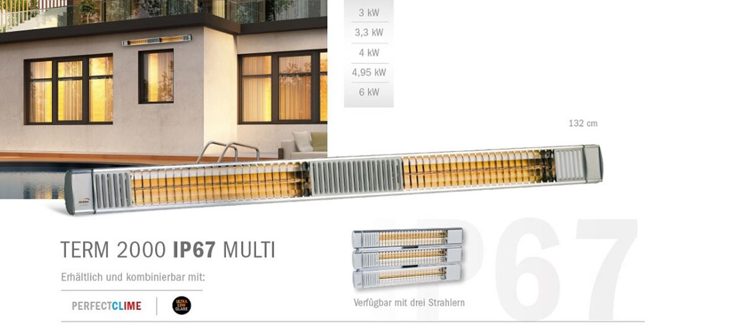 Den Doppel- oder Dreifachstrahler TERM 2000 MULTI erhalten Sie mit bis zu 80 Prozent reduziertem Rotlichtanteil in der Ausführung ULTRA LOW GLARE. Für die Inbetriebnahme des zwei- bis dreistrahligen Infrarotheizstrahlers wird ein 400 Volt-Anschluss benötigt.