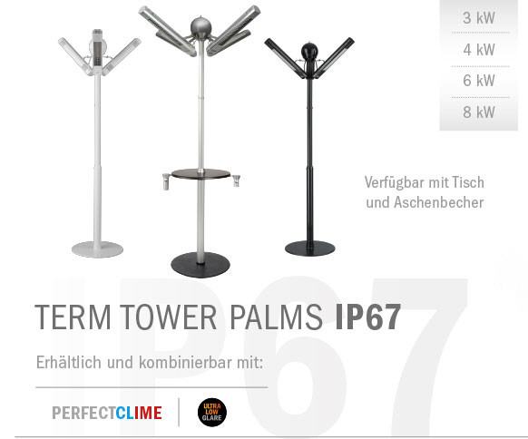 Dieser Tower sorgt rundum auf einer Fläche von ca. 35 - 44 m2; für angenehme Wärme. Die bewährte TERM Technologie ist in diesem Gerät ideal für Hotellerie und Gastronomie ausgebaut worden, besonders für den Einsatz in Bereichen, wo keine Befestigung möglich ist. Der TERM TOWER PALM mit integriertem Tisch und Aschenbecher, ist die clevere Lösung für alle Raucherbereiche, ideal für den Einsatz in der Gastronomie und Hotellerie.